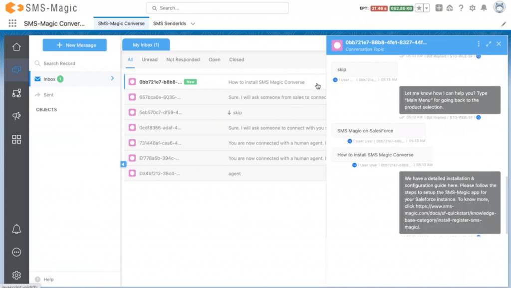 With this, the business users can always remain in sync with the communication history of each contact. They can also identify the responses that are sent by the human agent and those sent by the Bot.
