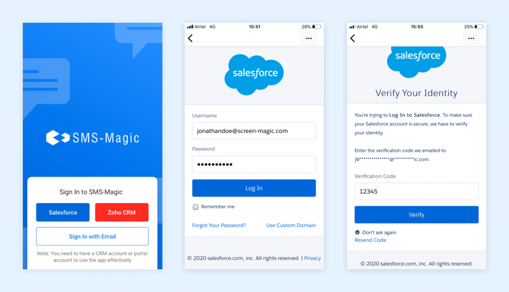 Once you configure the mobile app settings, you can sign in to the app through Salesforce by following the below steps. Here, you use your Salesforce credentials to sign in to the application.