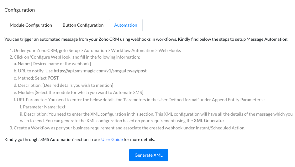 - In the Button Configuration tab, you’ll find instructions on how to create the Send SMS button for Zoho CRM.