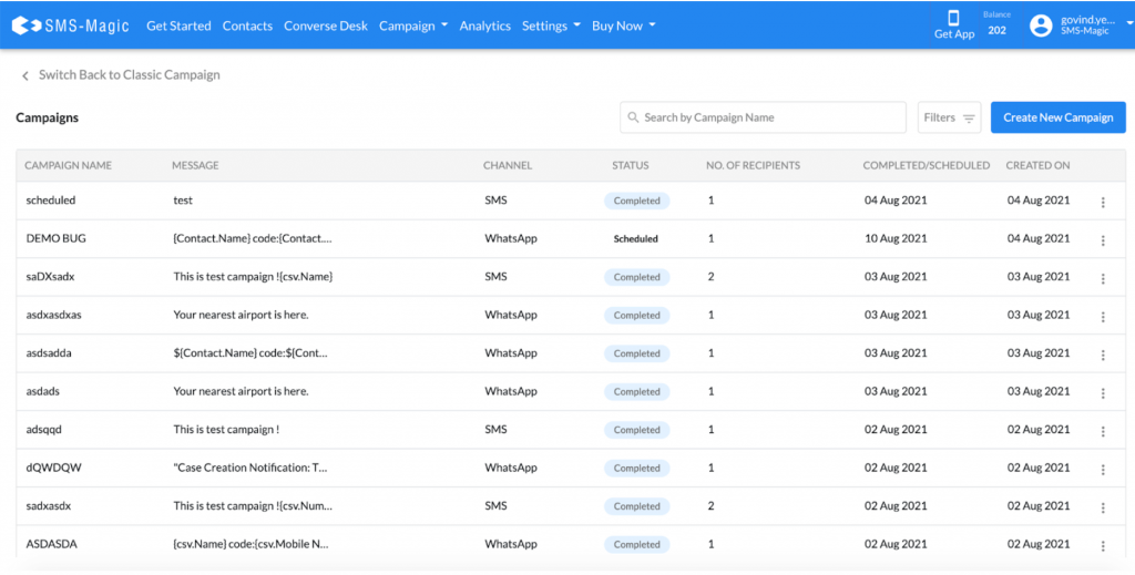 On the Campaign home page, users can view the list of campaigns created along with their details such as campaign name, message, channel, status, no. of recipients, the campaign created date, and the completed/scheduled date.