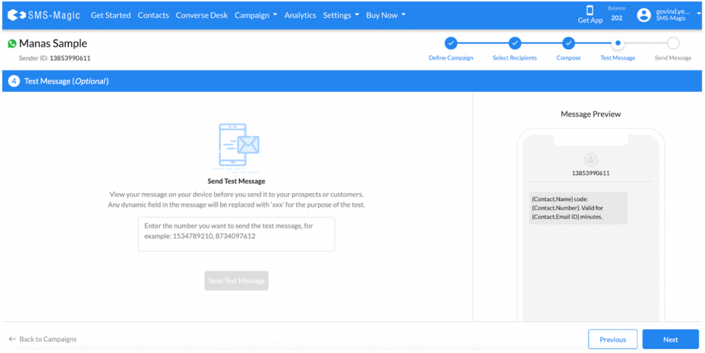 - Insert numbers in the box, separated by a comma, and click on the ‘Send Test Message’ button