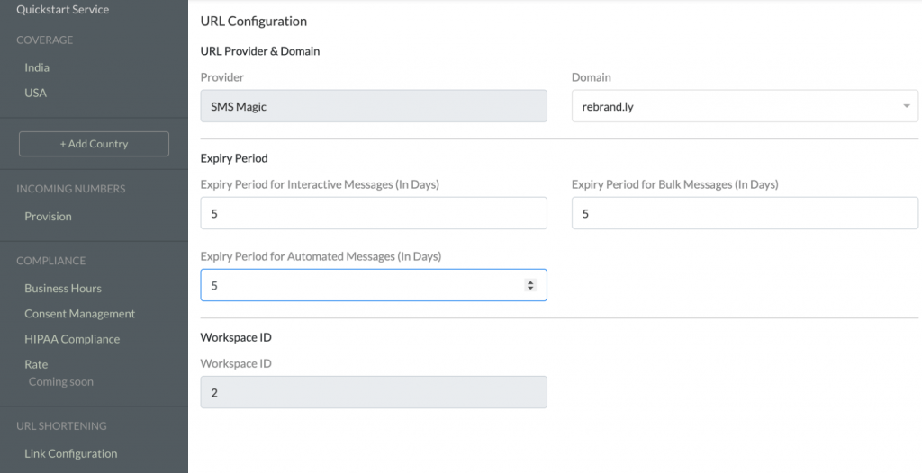 - The expiry period for the shortened links needs to be set in the setting page for respective features: Interactive Messages’, ‘Bulk Messages’, and ‘Automated Messages’.