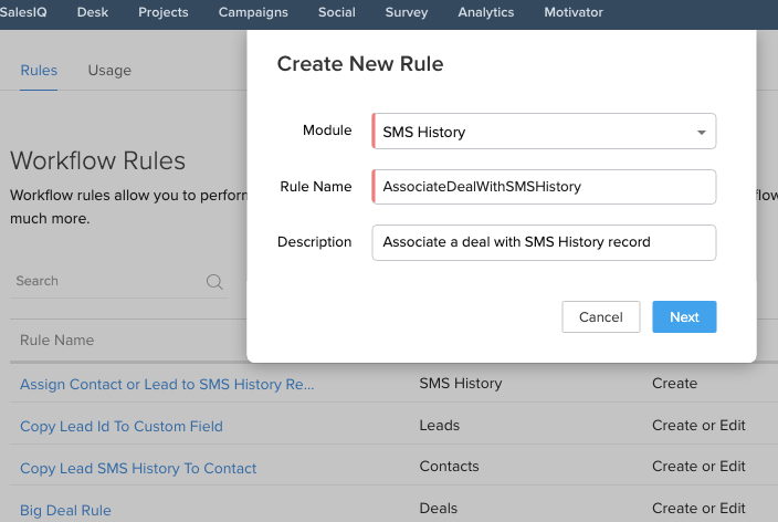 Create a Lookup field in SMS History for the custom module you wish to associate relevant SMS History records with. For the Deals module, we will create a lookup field – “Deal” in the standard layout of the SMS History module.