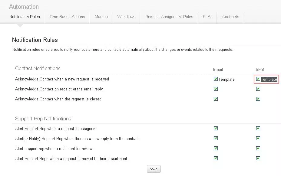 Auto SMS functionality support is provided for Zoho events such as request creation, request assignment, and request closure. SMS notifications can be sent to support representatives and any Contact.