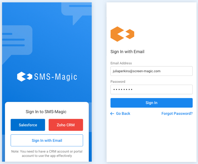 After you install the SMS-Magic Converse mobile app on an Android or iOS device, sign in to the application using valid credentials and start conversing seamlessly. To sign in to the SMS-Magic mobile app, users can use their Salesforce, Zoho, or Email credentials.