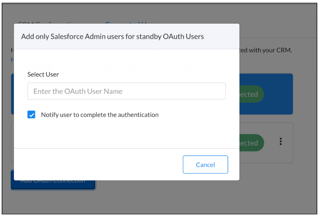 Once the user is added for OAuth, their status can be ‘Connected’, ‘Requested’, or ‘Disconnected’:
