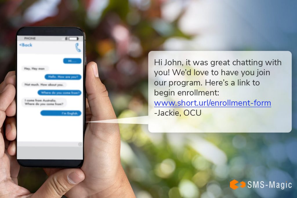 Text messaging makes it easier for you and your students to apply and confirm their enrollment and acceptance. Moving from email to text messaging for higher education also makes it easier for students to ask for your help and for you to continue building on the relationship you began during your recruiting process.