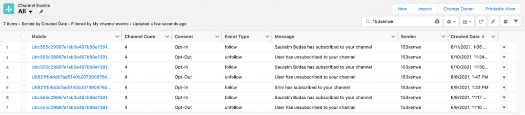 - Then, based on the follow/unfollow status, opt-in and opt-out consent will be mapped and the Consent will get created against that channel: